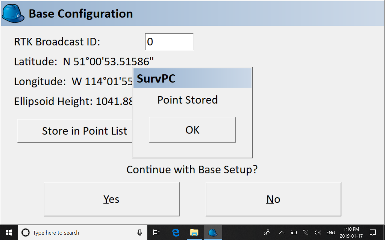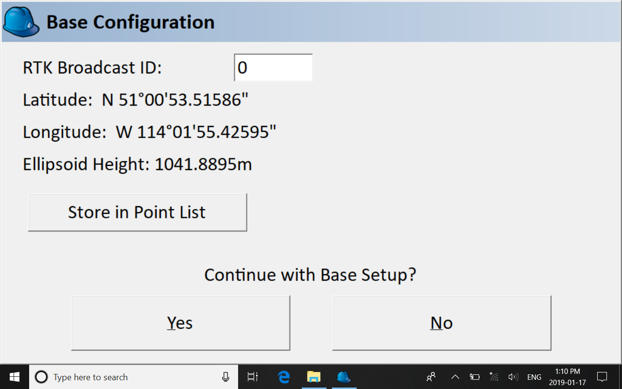 The user is asked if they want to save the base’s coordinates as a survey point. We save it and hit the green check mark.