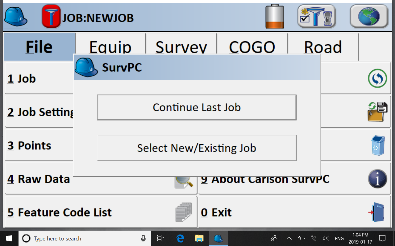 Click on the icon of your Carlson Surv software, 6.01 version or above. In case you start a new project, ‘Continue Last Job’ or ‘Select New/Existing Job’.