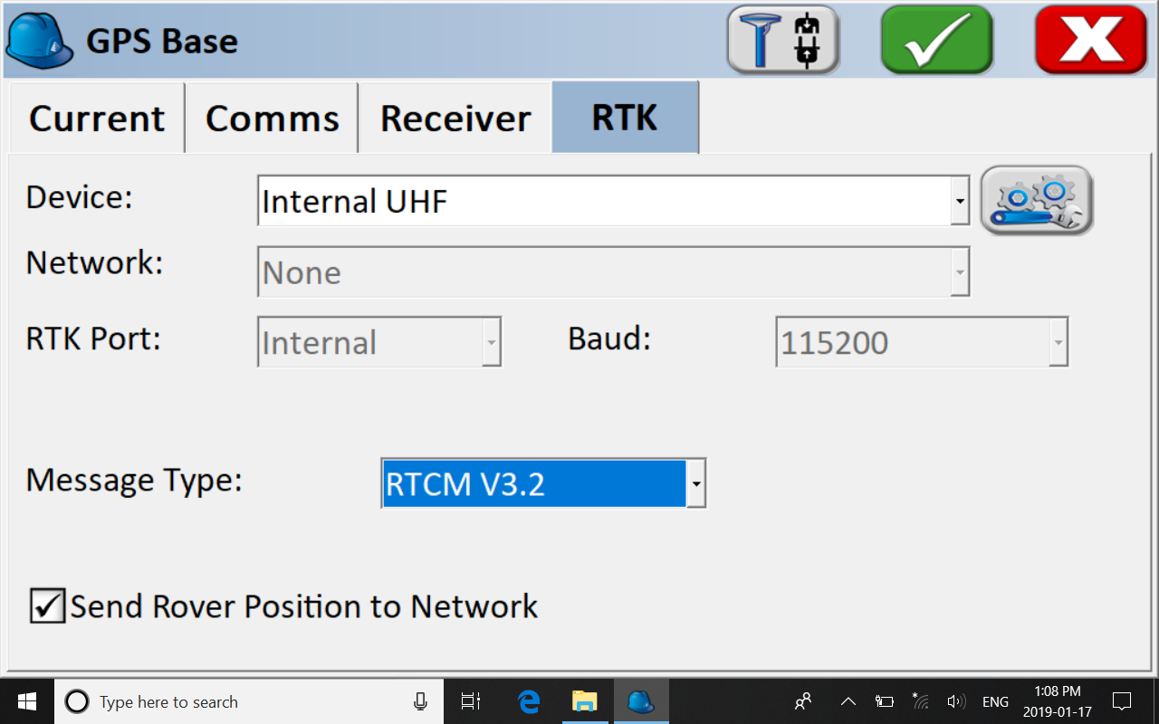 RTK settings, click on the green check mark in order to connect and start your base.